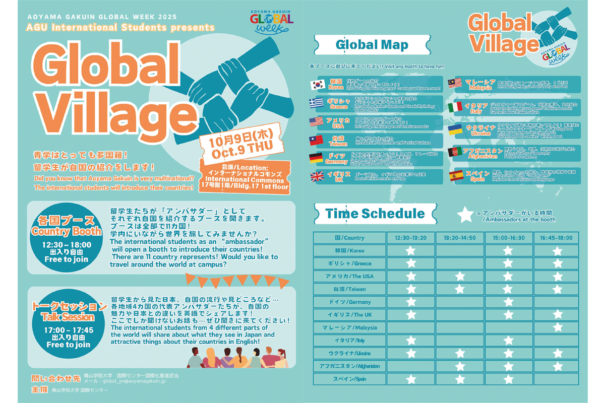 Global Village(グローバルビレッジ)では、本学に在籍する留学生が自国の「アンバサダー(大使)」となり、文化を紹介します!アンバサダーは国ごとにブースを設置しており、開催中はいつでも気軽に立ち寄ることができます。興味のある国のアンバサダーに会いに行ってみませんか?