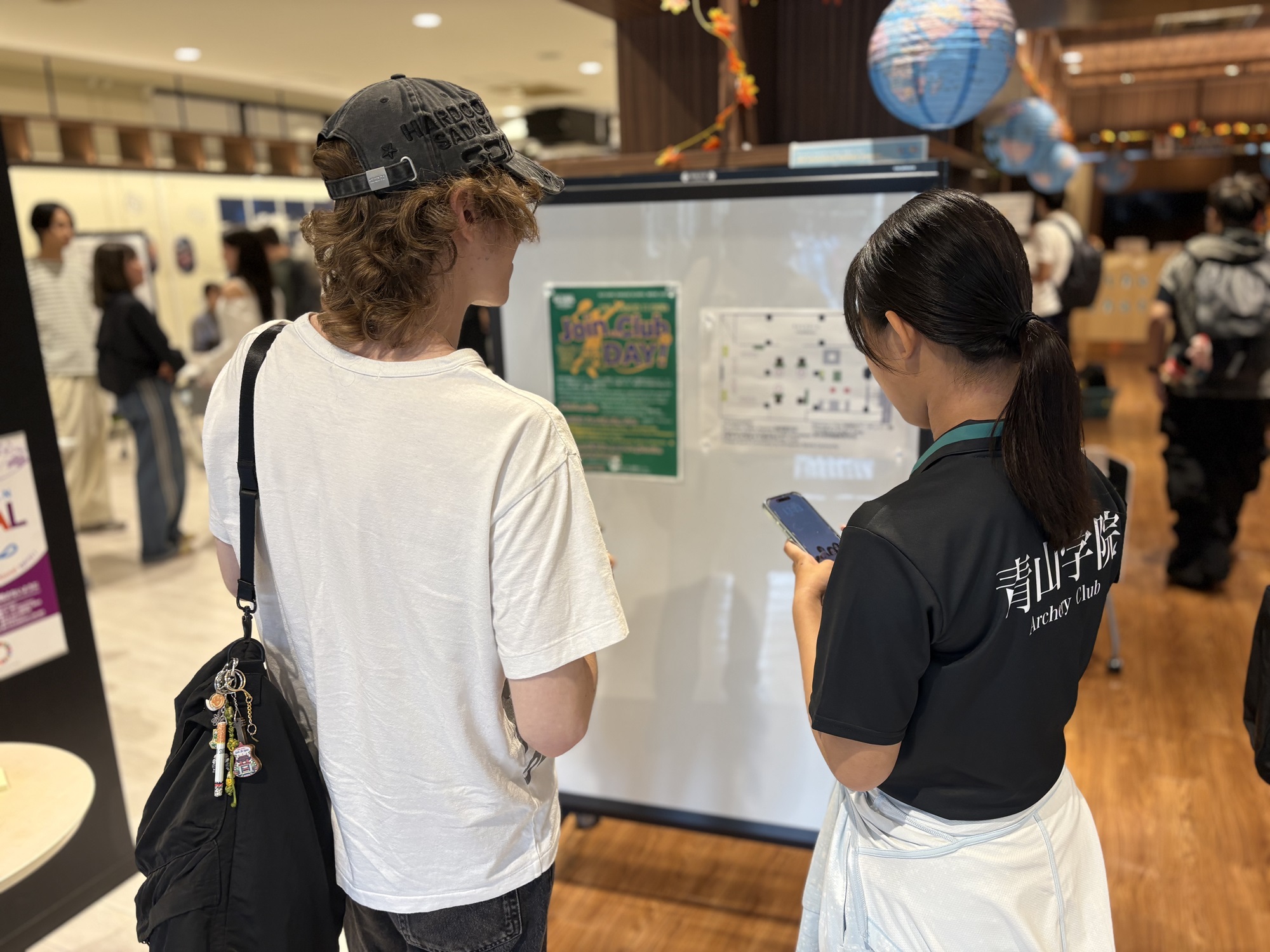 10月8日(水)に留学生と本学の学生団体を繋げるイベントとして「Join the Club Day!」を開催しました。留学生の入部を歓迎する7つのクラブ・サークルがブースを設け、多くの留学生が各ブースを巡りました。特徴のあるクラブが多く、代表学生は日本語や英語を交えながらそれぞれの団体の魅力を留学生に伝えていました。それぞれのブースでもらった案内チラシを見比べながら、真剣に加入団体を検討する留学生たちの姿が印象的でした。