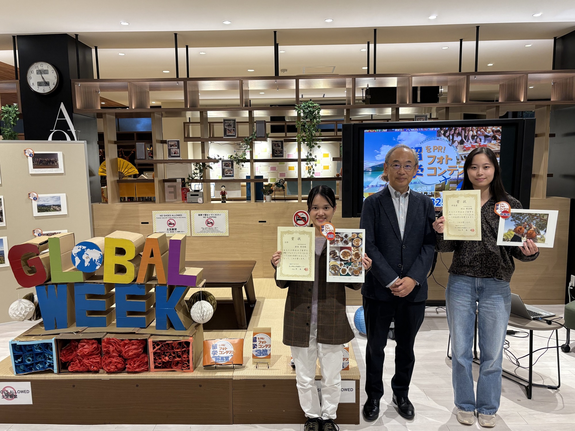 総計1,325件もの投票数があり接戦となりましたが、投票獲得数の多い上位3位、国際センター所長が選ぶ「所長賞」がそれぞれ選出され、10月9日(木)開催のGlobal Villageにて国際センター升本所長より賞状の授与が行われました。