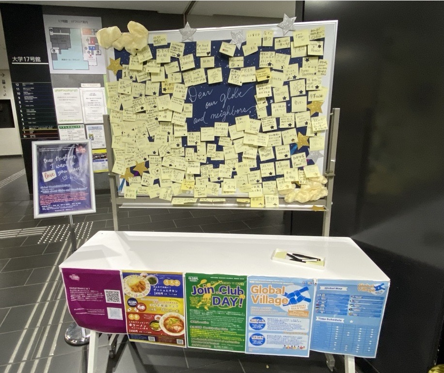 Global Weekの期間中、「地球や隣人との共生」のために私たちにできることはなにか、というテーマの掲示板を設置しました。具体的に日常生活で心掛けていることから、世界がこうなってほしい!という祈りまで、日本語に限らず様々な言語で、幅広い意見が掲示板に寄せられました。