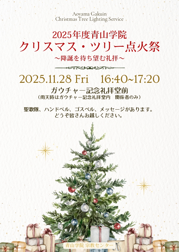 「青山学院クリスマス・ツリー点火祭~降誕を待ち望む礼拝~」を、下記のとおり各キャンパスにおいて行います。