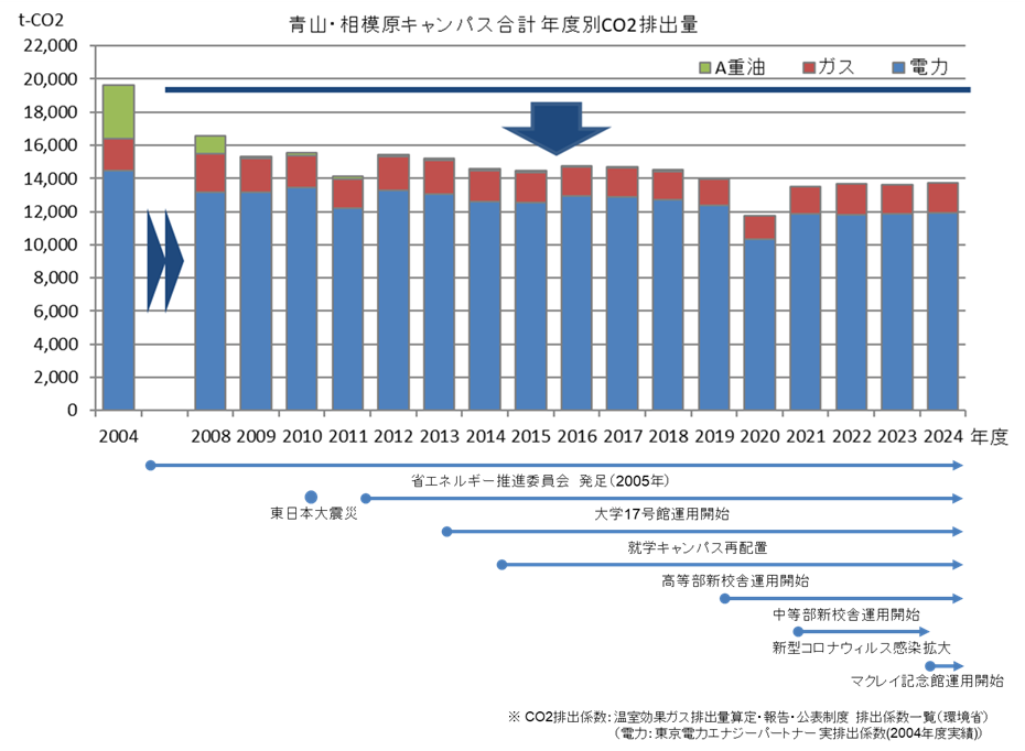 青山学院では温室効果ガス(CO2)の排出量を削減するため、2005年度から青山・相模原両キャンパスに「省エネルギー推進委員会」を設置し、組織的に「エネルギーの浪費をなくす運動」に取り組んできました。